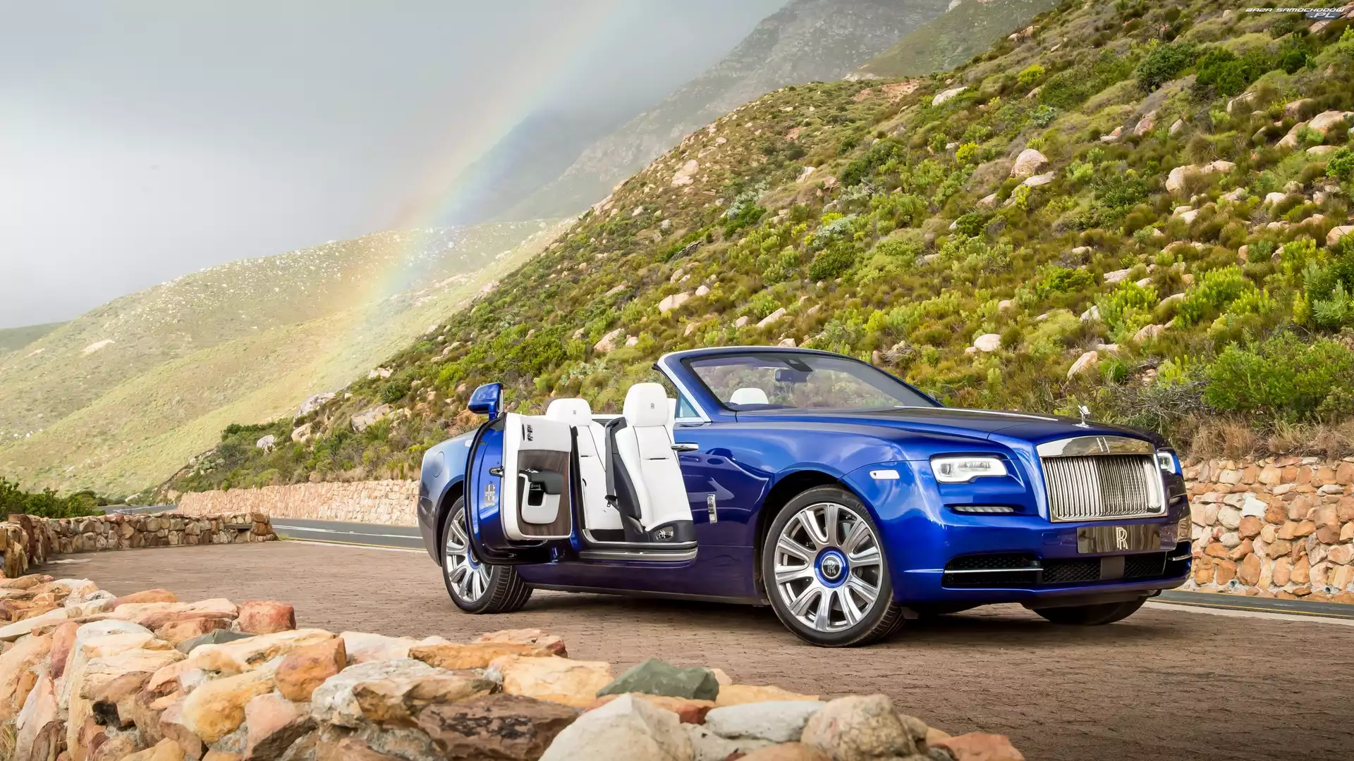 Samochód: Kamienie, Tęcza, Wzgórza, Niebieski, Droga, Rolls-Royce Dawn, Kabriolet, 2016
